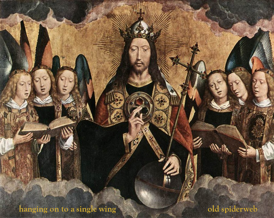 Sure, this is a photoblog, but my recent dabbling in haiga makes me want to branch out a little. This morning I opened the image on my laptop in GIMP (which has lots of fonts but a pretty awkward text-editing tool), tilted my head back, and gazed up at the corner of the ceiling. Good thing I’m not big on housecleaning.