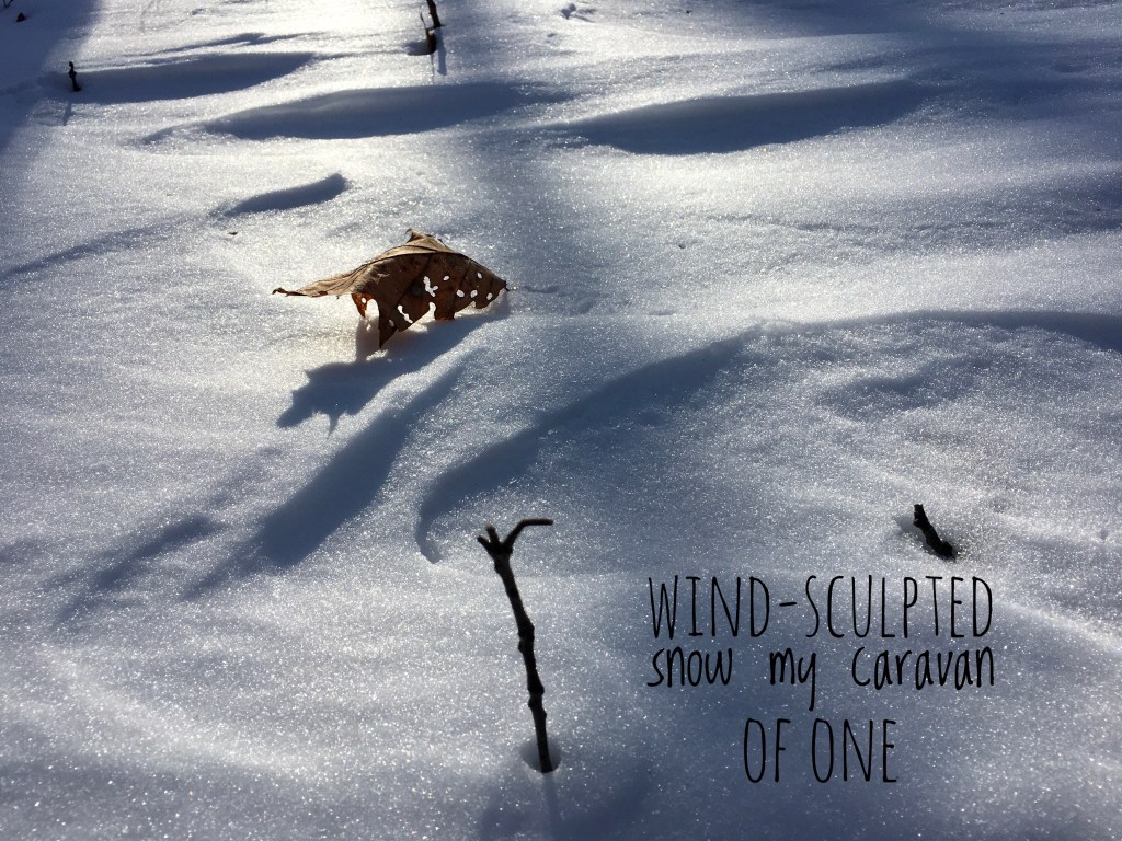 This is more a memory of past winters. What drifting we’ve had here, as in this photo, is just on the windward side of the ridges and easy enough to avoid trudging through (unless one is keen on a photo). The haiku occurred to me just now as I was going back through last week’s photos on my phone.