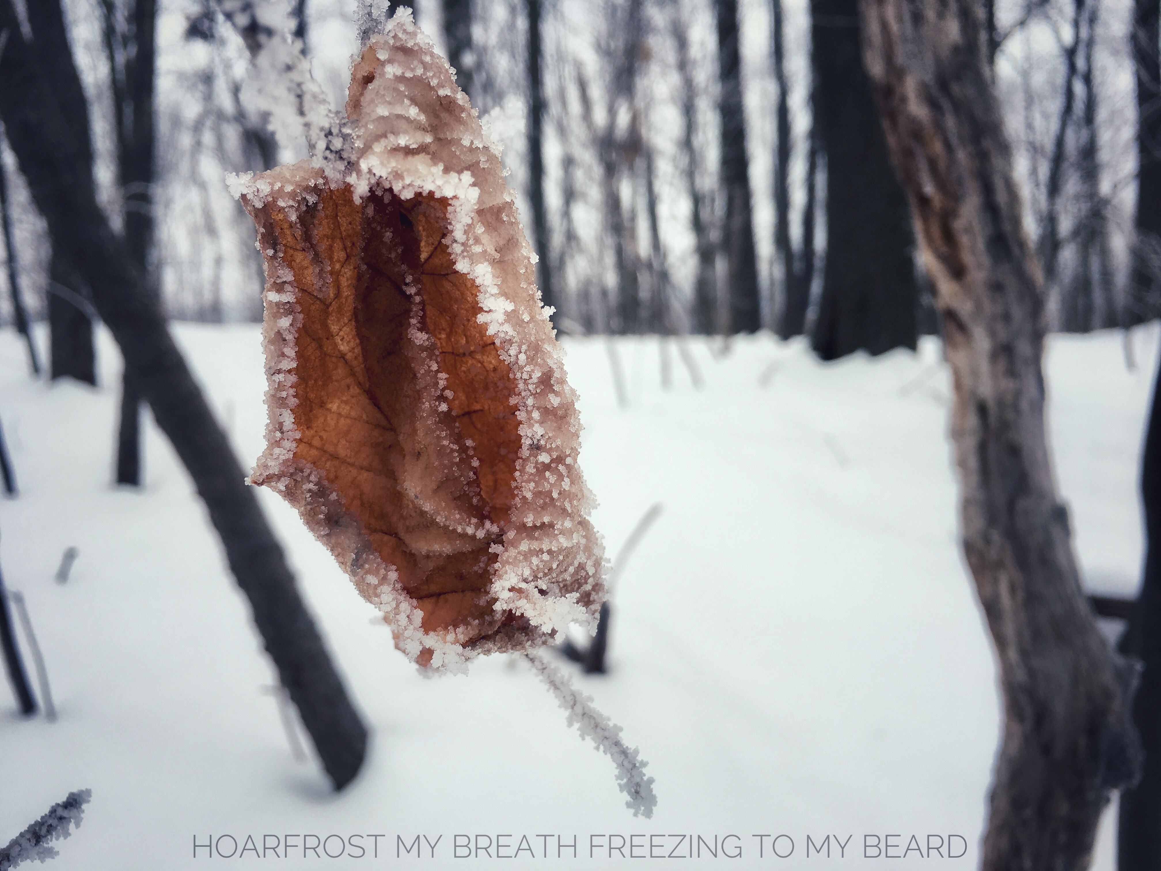Some ridgetop rime where a cloud sat. This was one of two good photos from yesterday’s walk, the other more conventionally pretty. But it was the weird, hood-shaped maple leaf dangling from the wrong end that prompted a haiku.