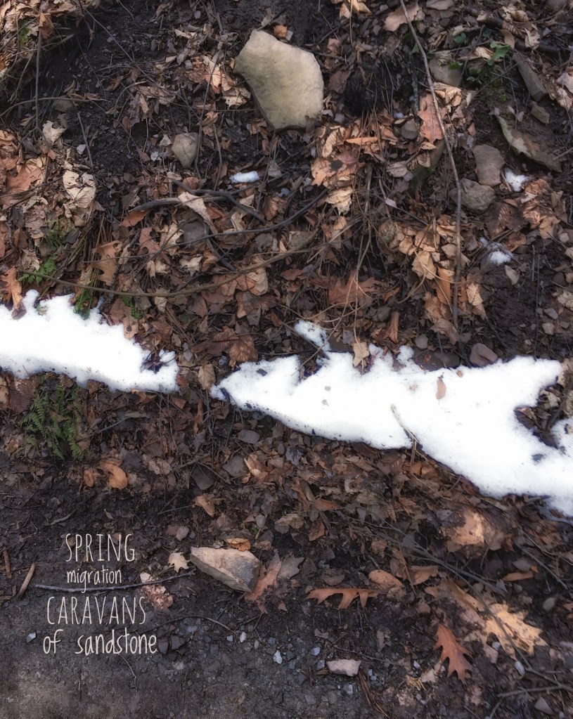 Proving that I have little sense of shame, here’s a haiga that I persisted in making despite being stuck with a mediocre to bad photo. (It was even blurry, so I added a glow effect to make the blurriness look intentional, suggesting movement.) The haiku adapts a long-standing family joke about annual rock migrations in the late fall and early spring. (Mountain humor, you know?) I wish I’d saved some of the drafts but they were all in my head as I walked up the hollow yesterday. It wasn’t until I stepped through my front door that “sandstone” occurred to me as an improvement on just “rocks” and then the whole thing clicked into place, simultaneously gesturing toward Orientalist notions of the exotic, the human rights of economic migrants, and geological deep time.
