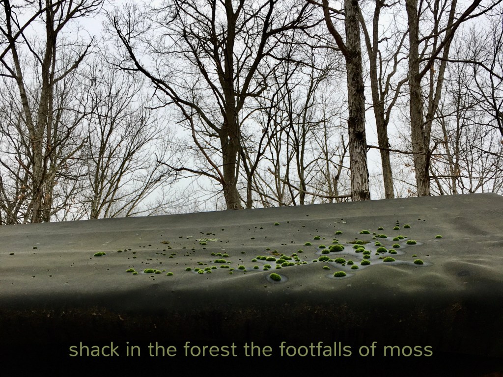 Given haiku’s extreme concision, it is sometimes necessary to adjust the facts to fit the reality of an insight. In this case, the tar paper roof is not on a shack, exactly, but a corncrib-like feeder for deer. (This is a former hunting camp acquired by a land conservancy and just transferred to the public in the form of new Pennsylvania state forest land.) But there are plenty of hollows around here where people are poor enough to inhabit shacks with roofs very like this one, so if readers imagine that kind of scenario, they’re not wrong.