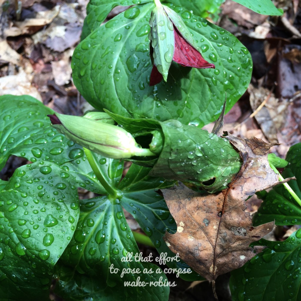 It was tempting to use another common name of Trillium erectum, stinking Benjamin, in the last line, but that made things entirely too unambiguous, I thought. (Maybe it’s the photographer, lying on the ground, you know?) The flowers mimic the color and smell of rotting flesh to attract flies so they can have sex. (Yep, nothing like telling children about the birds and the bees to fuck them up for life!)