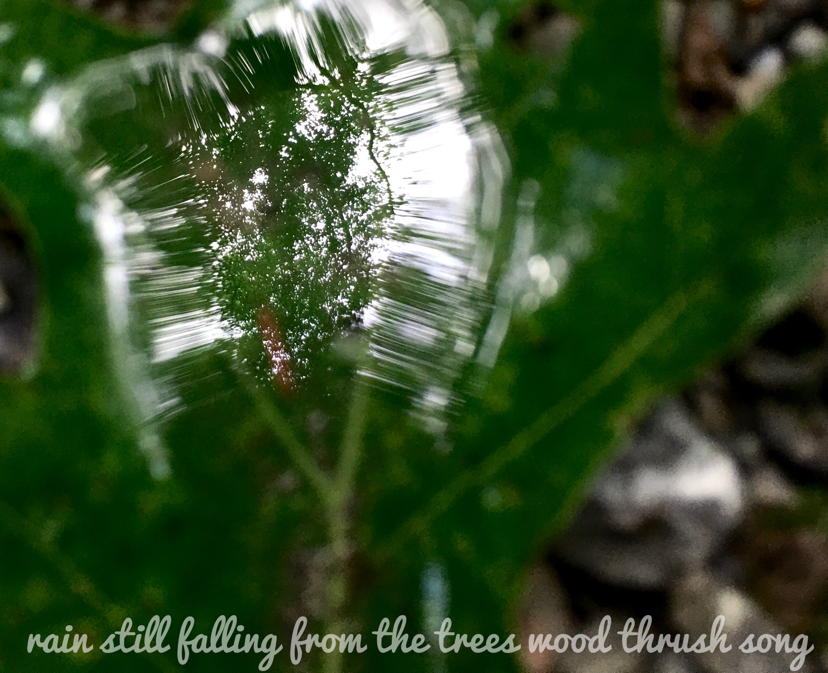 A nano-puddle in a fallen oak leaf. A wood thrush was singing while I crouched to get the shot. I was working with a much broader crop when the limitations of the free Snapseed app—most of the best font options, including this one, don’t permit line breaks—led me to experiment with bleed-through of contrasting colors at ~50% opacity to emphasize the semantic break.