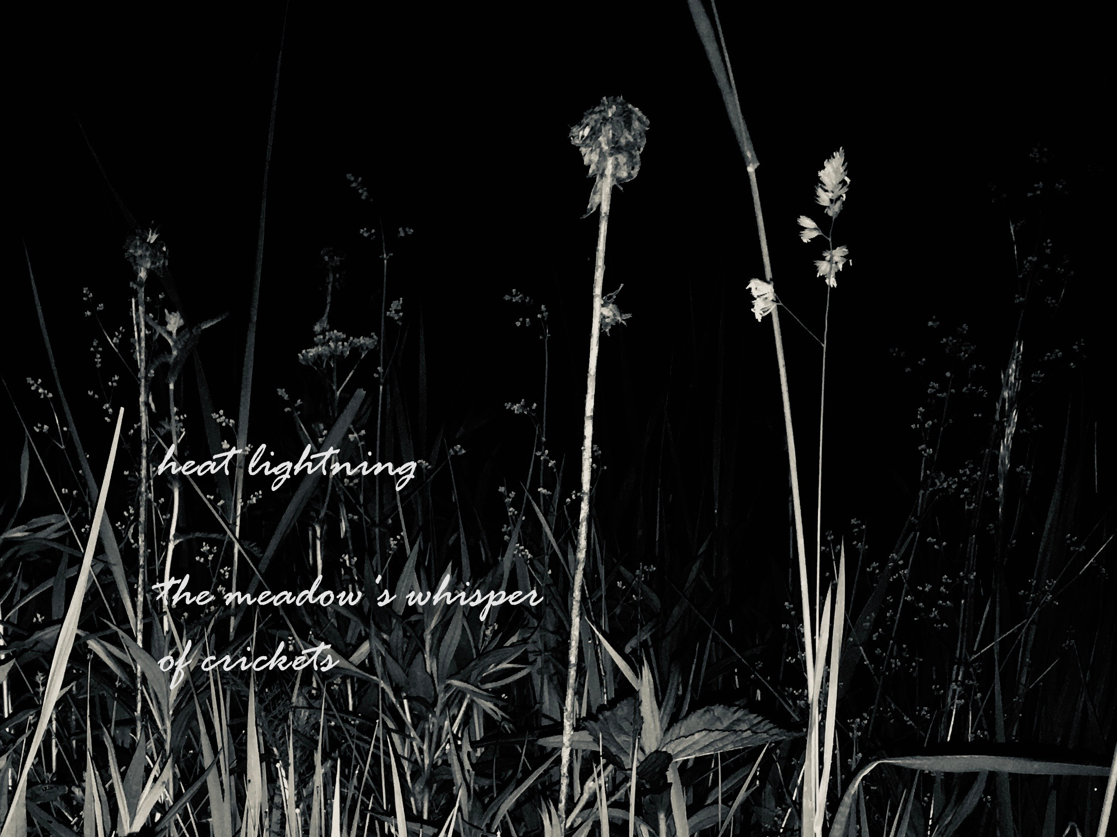 One of those haiku that really needs that space or punctuation in the semantic break. Written on the phone as I was walking back through our old field (hasn’t been plowed or planted in 50 years). Then I remembered that a) I had a flashlight, and b) the phone camera has a flash, so several minutes of photographic experimentation ensued. I did have to wait till I got back to the house in order to finish it up with GIMP on the laptop. The font is called Rage Italic for some damn reason. It’s certainly one of the most legible cursive fonts.