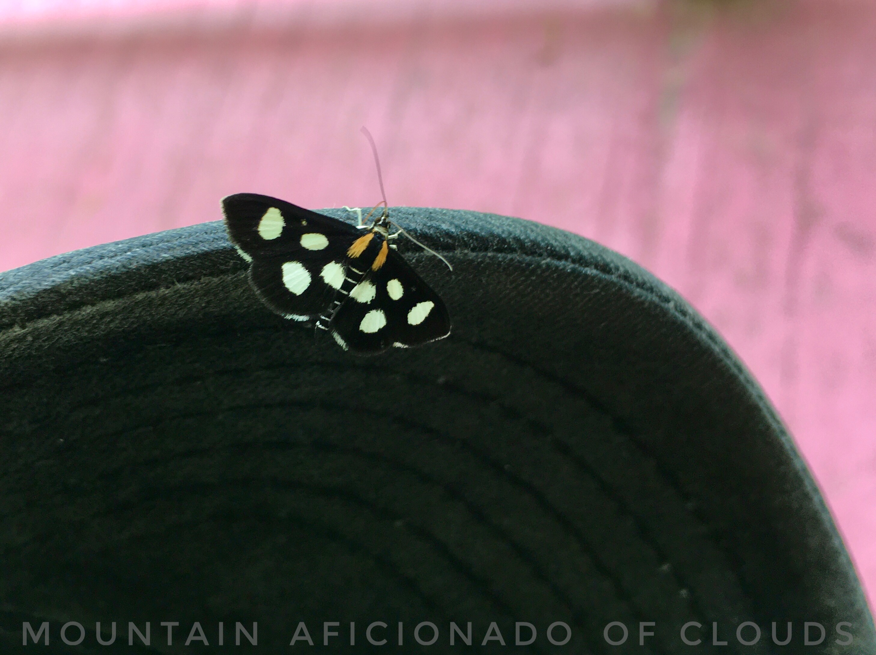 I keep trying to accumulate enough haiku to make submissions to certain hoity-toity journals that only consider haiku that have never been blogged or shared on social media, and then finding excuses to post them here anyway. Oops! In this case, the excuse was provided by an eight-spotted forester moth that landed on the brim of my ball cap, then obligingly stayed there while I de-capped, fished out my phone and took some snapshots.
