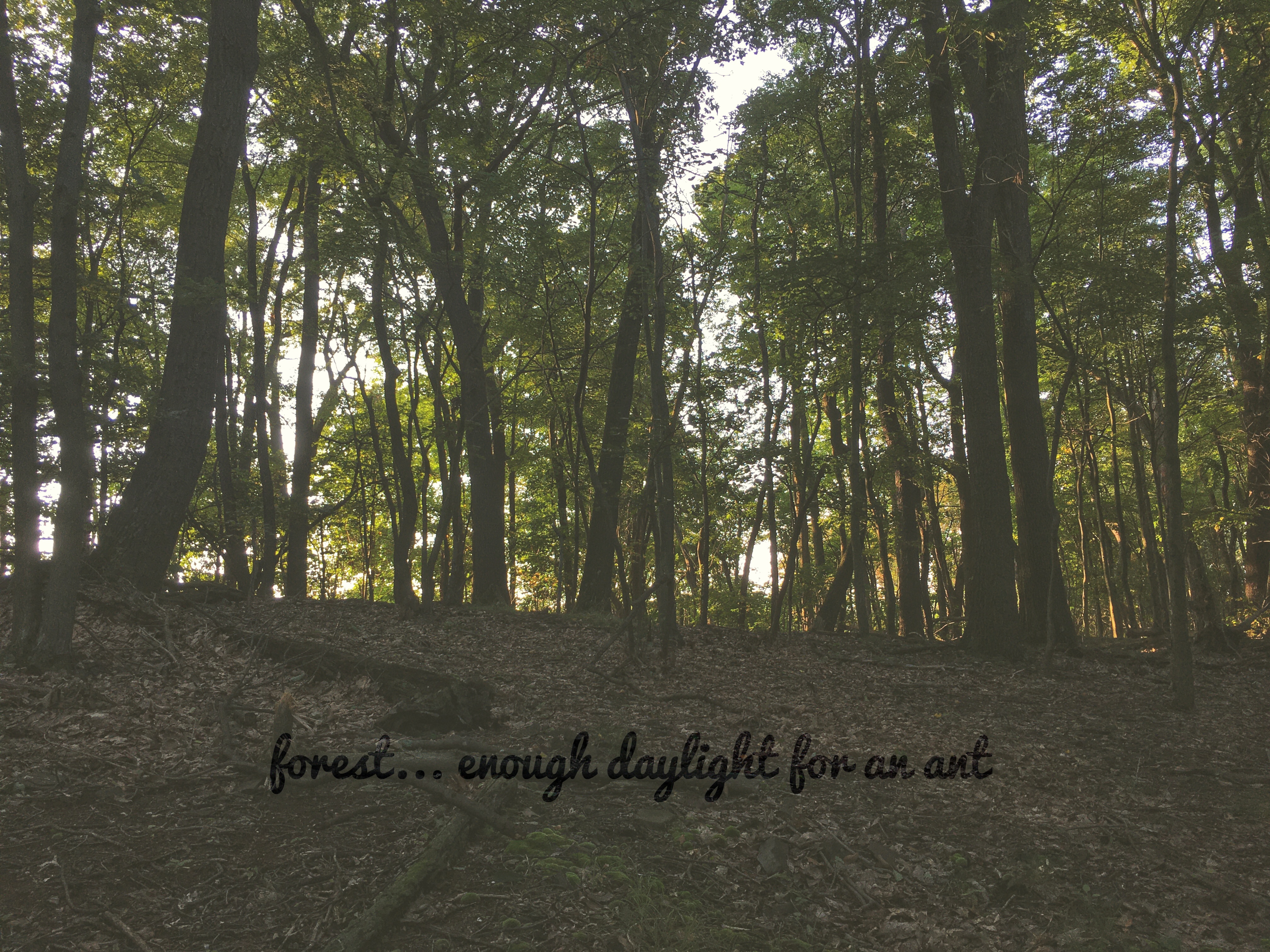 Experimenting with opacity in Snapseed’s Type tool. As for the haiku, I can’t decide whether “enough daylight for an ant” needs to go with something more striking, or whether it’s fine as a kind of comment on perceptions of forest darkness (haunt of the Big Bad Wolf and horror movie tropes, etc.).