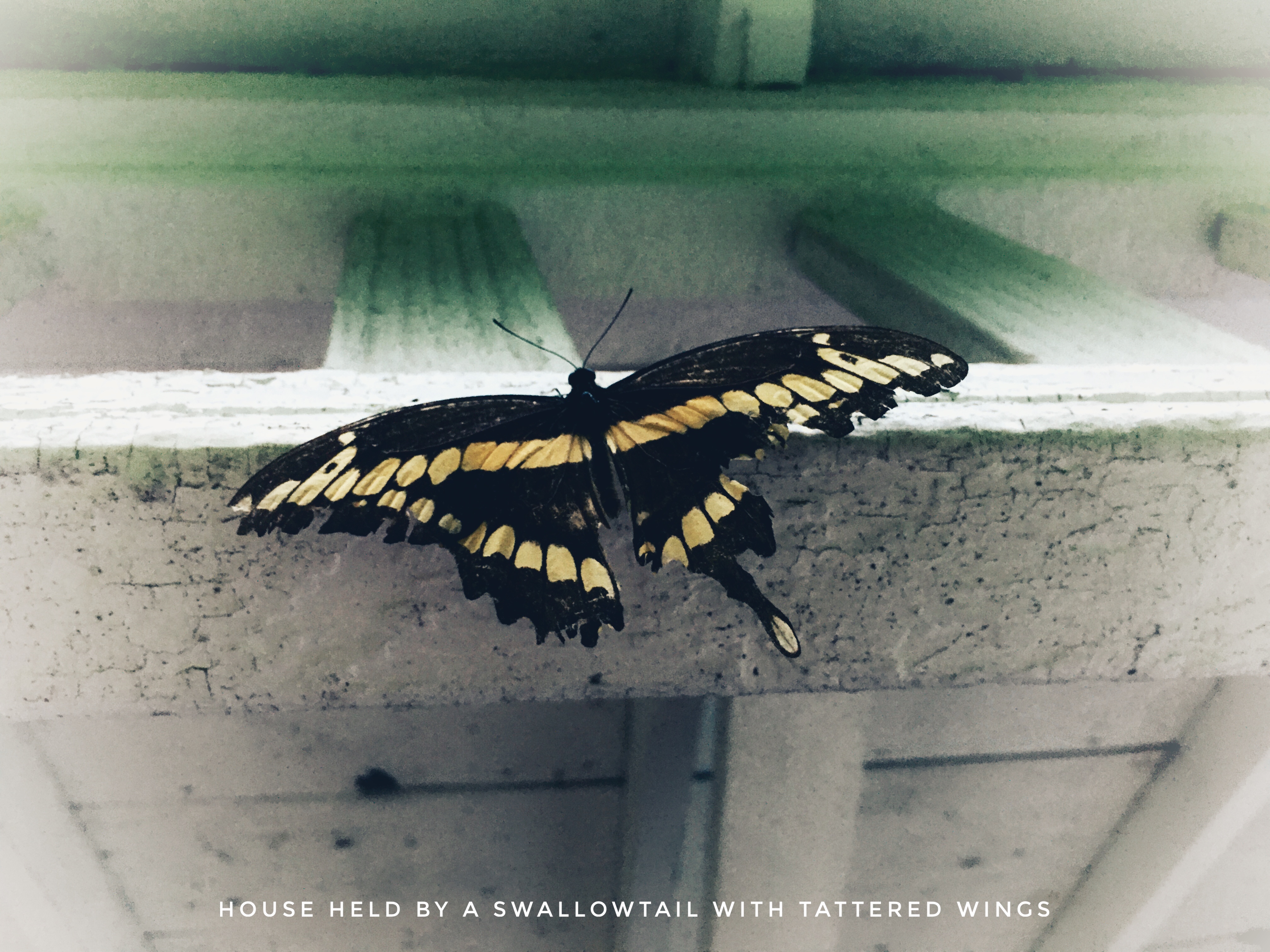 I spotted this giant swallowtail, an uncommon species here, on my front porch just after I’d posted about something else to The Morning Porch, so decided to make an Instagram post out of it instead. The haiku came to me in the shower. Since it also works as a caption, an old-postcard-style haiga seemed the obvious approach.