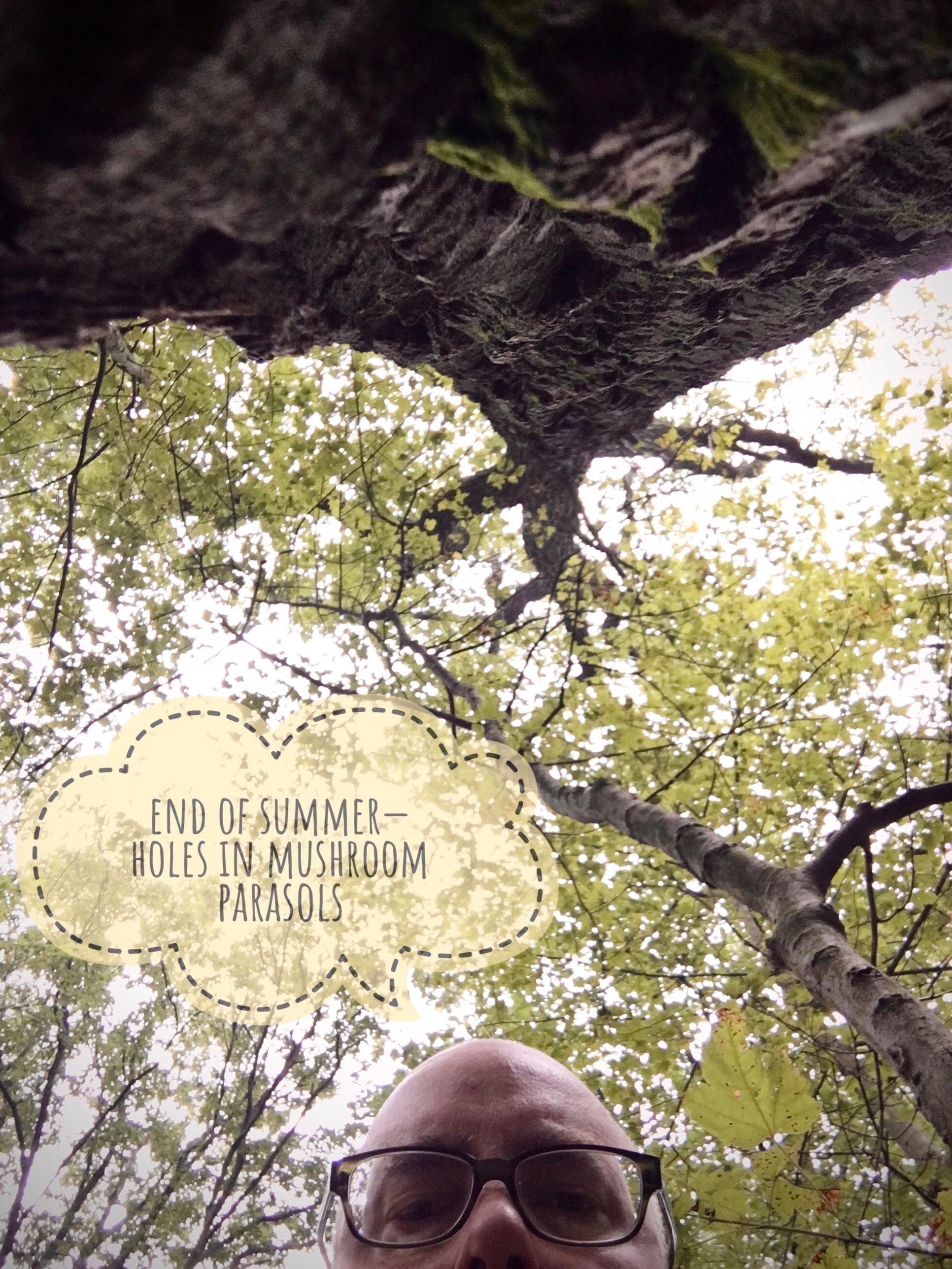 This is sort of on the line between haiku and senryu, I think, but the choice of image with a speech balloon for the text pushes it over into senryu territory. In fact because of that, I altered the text to refer to mushroom parasols in general, instead of “a mushroom parasol,” which would be more sabishii.