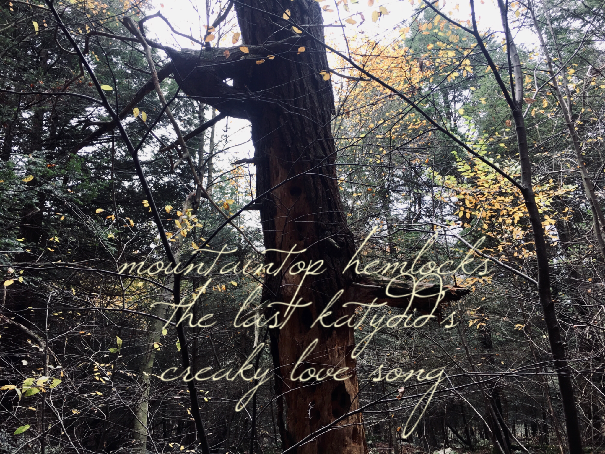 From a walk on a high portion of Tussey Mountain where fragments of the original, hemlock-dominated forest cover persist. I couldn’t decide whether they were the result of spotty cutting by 19th-century wood hicks, or simply that the boulder fields surrounding them keep deer numbers very low, allowing regeneration that mostly can’t happen on any more accessible location. At any rate, seeing all these hemlocks was well worth the climb, and I shot many, many photos. There were several lone katydids, spaced a quarter mile apart, so referring to this one as the last is a bit of a conceit, but it is very late in the season for these chorusing insects. I posted a full photo set from the walk to Facebook.