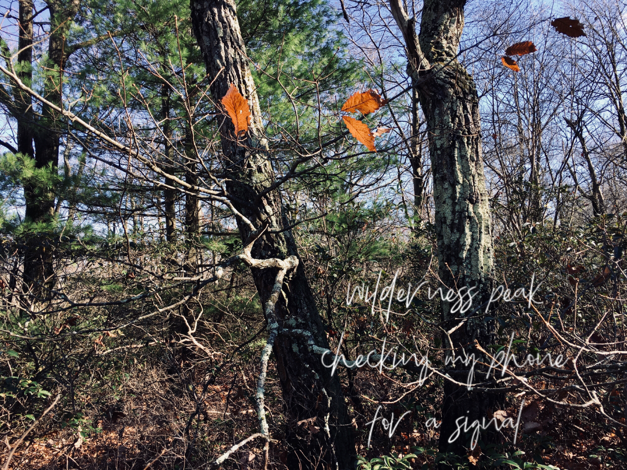 And because there was a signal, I made this haiga and uploaded it to Instagram on the spot (a ridge called Bald Mountain in central Pennsylvania’s Rothrock State Forest). Which is about as meta as I get.