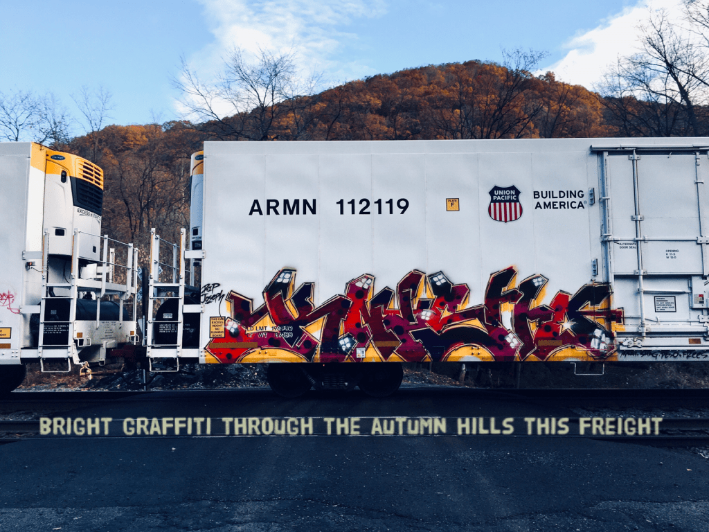 I’m not satisfied with this haiku, but it will do for now. Another draft began “street art gliding past our lonely crossing” but that was too awkward on the tongue. Plus I wanted the seasonal reference… though that ends up making the image seem rather redundant. Which redundancy I leaned into by positioning the haiku on the other track. Which may be entirely too cute.