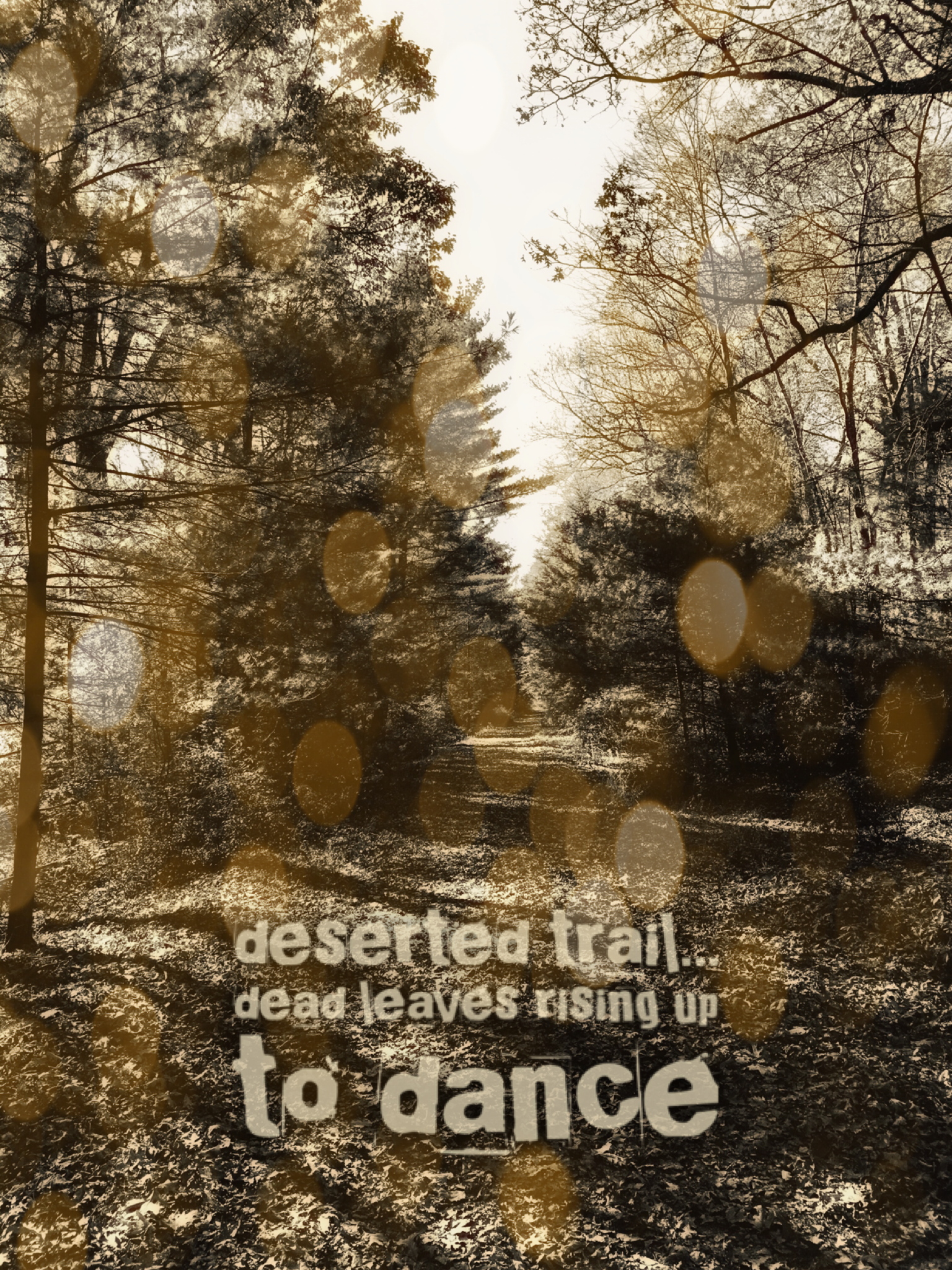 I wrote the haiku while walking a different trail from the one pictured here, but the light wasn’t good and I couldn’t get a photo for it. While processing this, I realized that the app, Typorama, has various layers one can add. Almost makes up for the appalling lack of sharpness to many of their fonts.