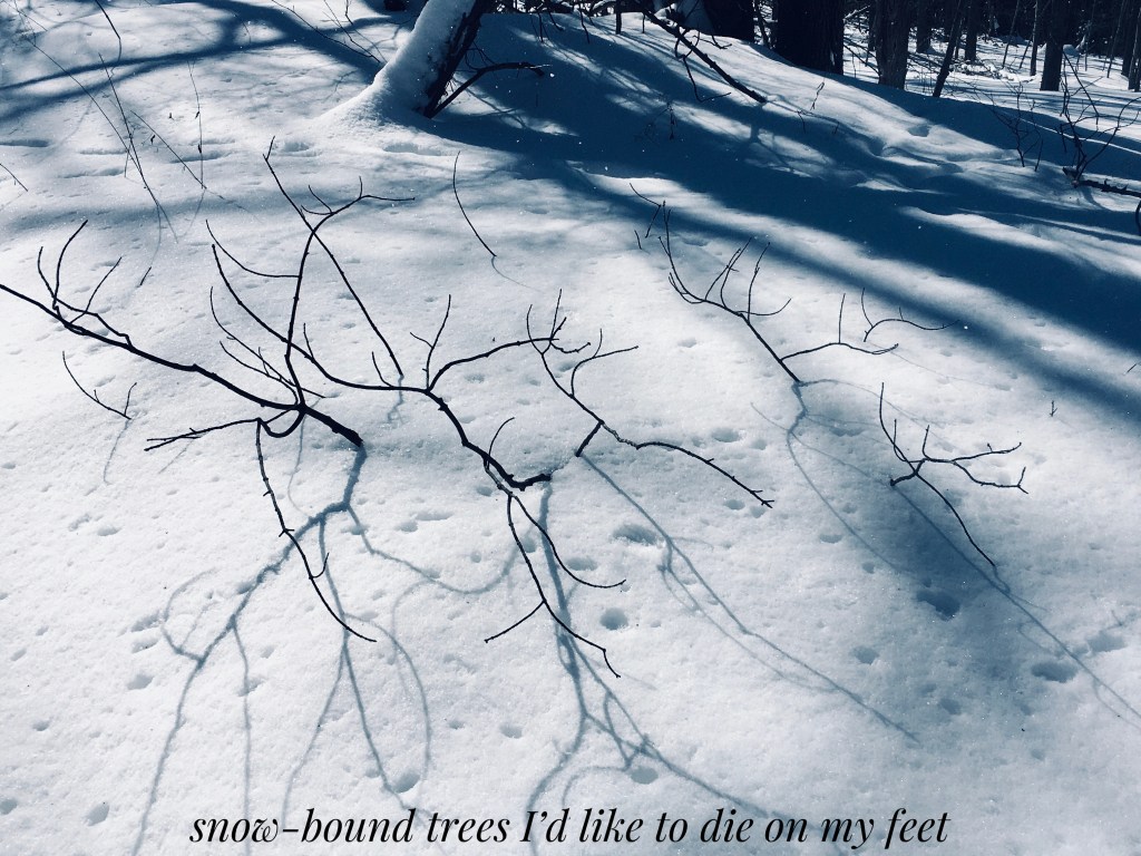 A cold and cloudless January day—perfect for a long walk on snowshoes. No one’s been on the trail for days. Voices around the next bend turn out to be a flock of robins.